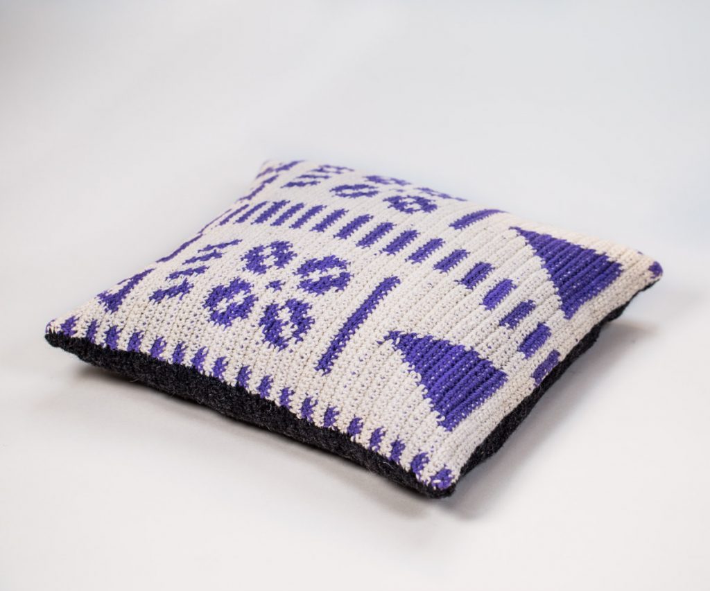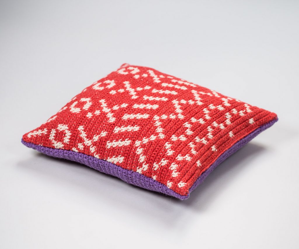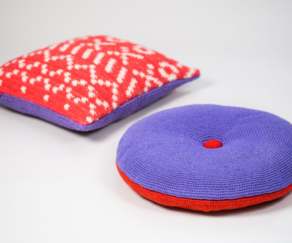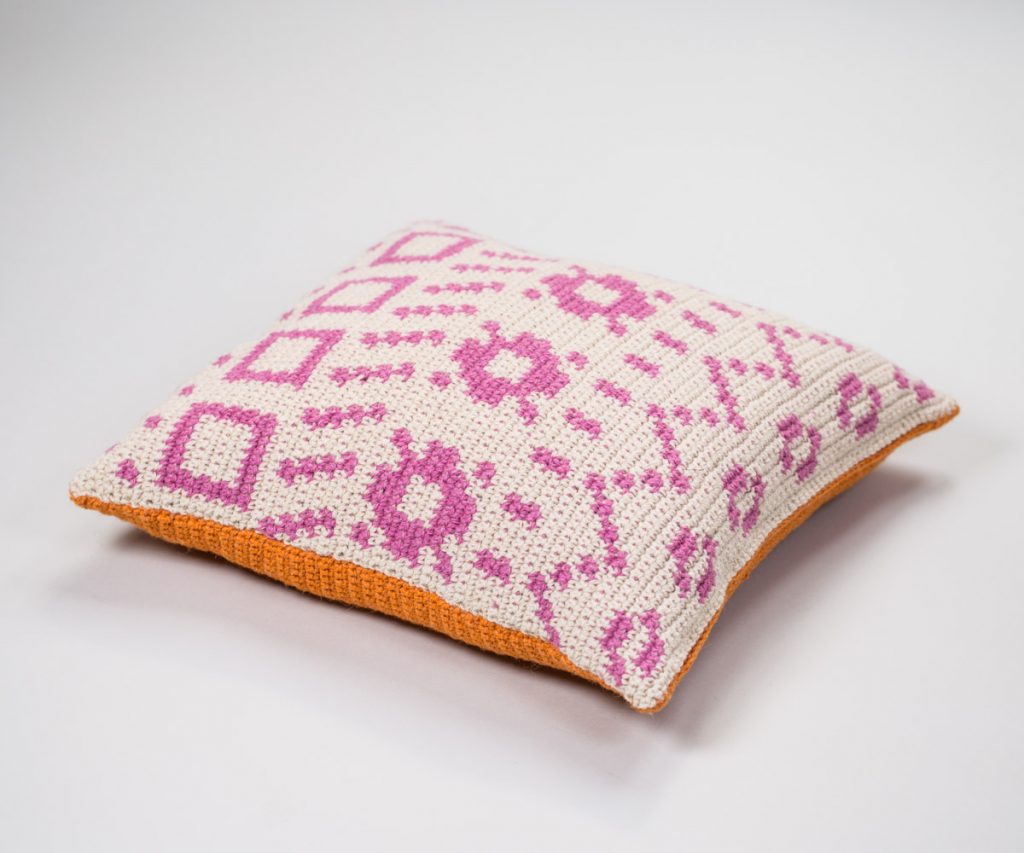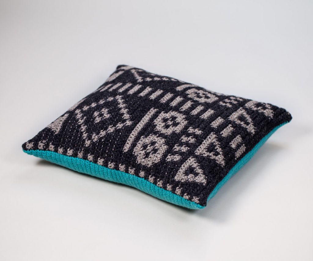 Oglate ročno kvačkane blazine Bojana krasijo manjši grafični vzorci na eni strani in barvno živahnejša gladko izdelana površina na drugi strani. Blazine lahko uporabljate na obeh straneh in v kombinaciji z drugimi blazinami, ki vsebujejo večje vzorce, gumbe, zanke, cofe ali resice.